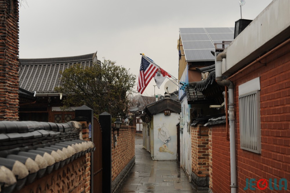 전주한옥마을에서 마주한 풍경이다. 태극기와 성조기, 그리고 정체를 알 수 없는 국기를 함께 내건 집 주인은 가문의 이력을 자신의 집 담벼락에 장황하게 설명해 놓았다. 성조기를 건 이유에 대해 직접적인 설명을 없었지만 내용으로 유추해보면 그 이유를 알 것 같다. 조금 더 걷자 태극기만 펄럭이는 집이 보인다. 태극기를 내 건 이유에 대한 설명은 없었다. 특별하게 태극기를 걸어야 할 이유도 짐작할 수 없었다. 지근거리의 이웃은 이렇게 서로의 다른 생각을 표현하고 있었다.