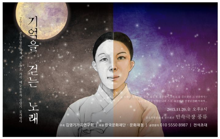 ■ 공연개요 ?공 연 명 : 2015 중요무형문화재 제30호 가곡 공개행사 기억을 걷는 노래 ?일 시 : 2015. 11. 20 (금) 20:00 ?장 소 : 중요무형문화재 전수회관 민속극장 풍류 ?출 연 : 김영기(중요무형문화재 제30호 가곡예능보유자), 중요무형문화재 제30호 가곡 이수자 및 전수자와 문하생, 음악동인 고물 ?후 원 : 한국..